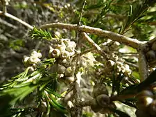 The flowers are white to creamy-yellow and arranged in heads on the ends of branches which continue to grow after flowering, sometimes also in the upper leaf axils. The heads are up to 20 mm (0.8 in) in diameter and contain 3 to 9 groups of flowers in threes. The flowers appear in winter and summer but are more prolific in spring. The petals are 1.5–2.5 mm (0.06–0.1 in) long and fall off as the flower opens. The stamens are arranged in bundles of five around the flower, usually with 10 to 15 stamens in each bundle. The fruit are woody capsules, roughly urn-shaped, 3–6 mm (0.1–0.2 in) long in small clusters along the stems.[2]