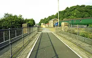 A new station at Meldon Quarry was opened during 2000 by Dartmoor Railway to act as the terminus of a passenger service from Okehampton. It has a single platform adjacent to the former up line but situated slightly nearer to Okehampton than the former Staff Halt. It is an entirely new construction unrelated to the previous Halt. The station was further improved in 2002 with the installation of concrete platform walling and a wooden platform shelter in BR Southern Region style and colour scheme. In 2015 the station was renamed Meldon Viaduct.[3] It is the current western terminus of Dartmoor Railway heritage passenger services to Okehampton and Sampford Courtenay. The station has no motor vehicle access but does have excellent pedestrian and cycle access via The Granite Way Cycleway, part of Devon Coast to Coast Cycle Route,[4] and has links to Dartmoor via the local footpath network. There is a buffet situated near the station in a former SR electric multiple unit buffet car. The car overlooks Meldon Viaduct and the surrounding valleys.[5]