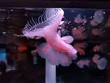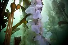 M. leonina are capable swimmers, however, they have rarely been observed leaving their substratum.[3] M. leonina swim through a behavior known as lateral bending.[10] Individuals swim by first closing their oral hood and releasing themselves from their substrate.[10] Next, they curl their foot and extend their cerrata.[10] They then flatten their body laterally, to create more surface area.[10] To propel themselves forward they bend their body from side to side, forming a "C" shape.[10][12] M. leonina are capable of trapping air in their hood for buoyancy.[12]