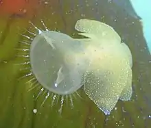 There are a single pair of rhinophores on the hood that contain four to six lamellae.[1] Two rows containing three to six pairs of flat, paddle-shaped cerata run along the body.[1] The cerata range in size, with the front most cerata being the largest.[1] Cerata are capable of autotomy.[4] There are unique granule filled cells at the base of the cerata that are found no where else in the animal that seem to be involved in breaking down connective tissue, as well as two special muscular sphincters. It is thought that after the connective tissue is broken down, these sphincters contract to cut the cerata and then close the wound.[5] The anus and nephroproct are positioned before the second ceras.[1] All other members of the genus Melibe contain chitinous plates in the stomach, however, they are absent in M. leonina.[1]