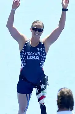 Turning to triathlon after the Beijing Paralympics, Stockwell was selected to represent the US in the 2010 ITU Paratriathlon World Championships in Budapest. She won the Women's TRI-2 (above knee amputee) class, then successfully defended her TRI-2 World Champion title in 2011 and 2012.[9] She is a multiple US National Paratriathlon Champion in her classification,[10][11] and was named USAT Paratriathlete of the Year in 2010[12] and 2011.[13] As of January 2013 Stockwell is at the top of the ITU's rankings in the women's TRI-2 class.[14] She won a bronze medal in the PT2 category at the 2016 Paralympics.[15]