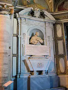 The tomb of Cardinal Giovanni Garzia Mellini (died 1629), the vicar general of Rome was created by Alessandro Algardi in 1637-38.[6] The monument was erected by the cardinal's nephews, Mario and Urbano Mellini but only after a conspicuously long time their uncle's death. The centrepiece of the monument is the white Carrara marble bust of the Cardinal in a niche which shows him leaning forward and turning towards the altar, his left hand on his heart and his right hand holding a prayer book. The work was much admired in Algardi's day because it conveys a sense of Baroque piety combined with expressive realism and brilliantly observed, technically perfect details. The monument itself is a classicising aedicule framed by flat pilasters with masks and crowned by a broken segmental pediment with the Mellini coat-of-arms in a conch. The big letter M, the main symbol of the family, recurs on the trapezoid sarcophagus (and the other Baroque tombs in the chapel). The Doric frieze is decorated with ecclesiastical objects (crozier, chalice, holy vessels and mitre). The voluminous epitaph follows the stages of Giovanni Garzia's prestigious career from his youth until his death, including his important diplomatic missions for Pope Paul V to Philip III of Spain and the warring Habsburg brothers of Emperor Rudolf II and Matthias.