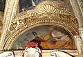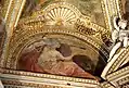 The oldest monumental tomb in the chapel is the funeral monument of Cardinal Giovanni Battista Mellini (died 1478), the Bishop of Urbino and the younger brother of Pietro Mellini. Giovanni Battista played an important part in the reconstruction of Saint Peter's Basilica during the reign of Pope Sixtus IV. The funeral inscription mentions his mission as papal legate to Milan in 1477. The monument was dismantled by Cardinal Savio Mellini in 1698 who appropriated the architectural frame for his own tomb and placed the effigy of his forefather in front of the new monument. This effigy lies on a bier decorated with richly handled fruits and flowers. The drapery on the figure runs in one sweep from head to foot.[4] A 17th-century drawing in Windsor Castle preserved the original appearance of the tomb. Above the effigy there was a relief of Christ, the Man of Sorrows, being raised by angels from his tomb. The base of monument was decorated with the figures of two cherubs and the top was crowned with a shell pediment.