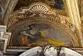 The large tombstone (in the floor) of Cardinal Mario Mellini (died 1756) is inlaid with a mosaic of colourful stones. The inscription says that Mellini was minister plenipotentiary at the Holy See of Maria Theresa, Empress and Queen of Hungary "in the most difficult times", and his tomb was erected by his nieces, Anna Serlupi and Giulia Falconieri and his nephew, Antonio Casali in 1760. The epitaph is set in a Baroque crest which is flanked by green olive branches and surmounted by the coat-of-arms of the cardinal. The allegorical figures of Prudence (left with mirror in her hand) and Fortitude (right with sword) are reclining on the top of the crest. The sepulchre was created by the mosaicist Carlo Lecchini after the design of architect Giuseppe (?) Ferroni.[12]