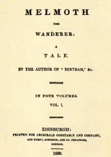 Melmoth the Wanderer is an 1820 Gothic novel by Irish playwright, novelist and clergyman Charles Maturin. The novel's titular character is a scholar who sold his soul to the devil in exchange for 150 extra years of life, and searches the world for someone who will take over the pact for him, in a manner reminiscent of the Wandering Jew.[1]