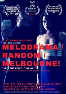 Melodrama/Random/Melbourne is an Australian feature film about a young feminist filmmaker documenting the men's rights movement and seduction community pickup artist (PUA) movement.[2][3] The film is part two in Matthew Victor Pastor's Fil-Aus trilogy. It had its Australian premiere at the 2018 Adelaide Film Festival, Philippine premiere at the 2018 Sinag Maynila Film Festival and its North American premiere at the 2018 Mammoth Lakes Film Festival.[4] In 2019 the film's soundtrack was nominated for the 67th edition of the FAMAS Award (Filipino Academy of Movie Arts and Sciences Award) for composer Fergus Cronkite.[5]