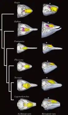 The melons of Delphinidae (dolphins) and Physeteroidea (sperm whales) have a significant amount of wax ester, whereas those of Phocoenidae (porpoises) and Monodontidae (narwhals and beluga whales) contain little or no wax.[6] The speed of sound in the melon is lowest in the Delphinidae, Phocoenidae and Monodontidae, intermediate in the Ziphiidae (beaked whales), and highest in the Physeteridae and Platanistidae (South Asian river dolphins).[7]
