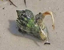 | A live Melongena corona in the process of rolling over using its operculum | |