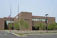 In 1975, a new "modern" Melrose High School opened next-door to the old one, which became the middle school. This building is renowned for its "open spaces," which were large open areas with movable walls.[7] Less than half of the buildings classrooms were in open spaces and the rest were triangular in shape. The school was supposedly built by an architect who also designed prisons and the building style reflects this. Numerous classrooms contain no windows and masonry is the main building material. Windows appear in a select few classrooms and are plentiful, yet most don't open. There is a constantly running air circulation system to combat the window problem and this also cools the building in the summer.