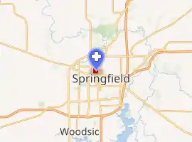 The hospital originally opened on April 19, 1897, as Springfield Hospital and Training School with twelve patient beds at the corner of Fifth Street and North Grand Avenue.[4][15] The original hospital was affiliated with the Lutheran Church–Missouri Synod, but in 1931 the church broke ties with the hospital. In 1941, the hospital was renamed to Memorial Hospital. A new building was erected in 1943 at its current campus location at First and Miller Streets with a patient capacity of 270.[16] The first kidney transplant in Springfield occurred at the hospital on October 21, 1970. The procedure lasted for five hours and the patient previously had a heart valve replaced just under nine months earlier.[17] In 1974, the hospital was renamed to its current name, Memorial Medical Center.[18]