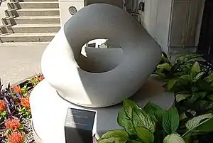 When Rodgers was selected to make the artwork, he was faculty member of the Interior Design Program at IU of Pennsylvania in Indiana, Penn. He communicated directly with Robert Yassin during the planning stages of the commission. In 1981 Rodgers was hoping to make a sundial, but the design had to be scrapped because the funds provided were not enough to cover the complexities involved in the construction of such an object. A few years later his dream of making a sundial became possible with a large commission by Crown Hill Cemetery as the Equatorial Sundial.[3] For the Valentine commission, Rodgers ended up carving a Mobius strip-styled arch which recalled the arched doorways and bridges common in Prague.