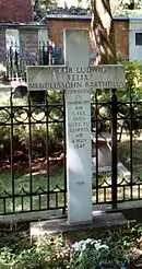 Felix's funeral was held at the Paulinerkirche, Leipzig, and he was buried at the Dreifaltigkeitsfriedhof I in Berlin-Kreuzberg. The pallbearers included Moscheles, Schumann and Niels Gade.[78] Mendelssohn had once described death, in a letter to a stranger, as a place "where it is to be hoped there is still music, but no more sorrow or partings."[79]