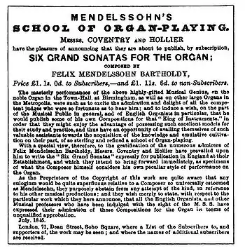 Mendelssohn played and composed for organ from the age of 11 until his death. His primary organ works are the Three Preludes and Fugues, Op. 37 (1837), and the Six Sonatas, Op. 65 (1845), of which Eric Werner wrote "next to Bach's works, Mendelssohn's Organ Sonatas belong to the required repertory of all organists".[151]