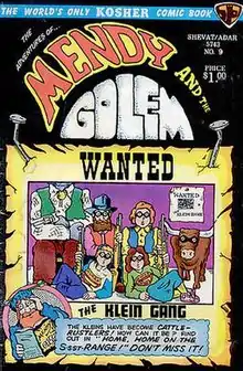 Billed as "The World's Only Kosher Comic Book", Mendy Enterprises' Mendy and the Golem first appeared in 1981. Written by Leibel Estrin and drawn by Dovid Sears, the comic book featured the offbeat misadventures of Mendy, an Orthodox Jewish boy, and his pet Golem. Other characters include Mendy's parents, Rabbi Yaakov and Sara Klein; Mendy's sister, Rivky; and a host of colorful supporting characters such as Moshe the Mayven; the Lone Stranger and his faithful friend Toronto; Captain Video; Dr. Hardheart and his evil robot Oy Vayder; and Professor Nemo.