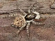 Menemerus is a genus of jumping spiders that was first described by Eugène Louis Simon in 1868.[4] They are 4 to 10 millimetres (0.16 to 0.39 in) long, flattened in shape, and very hairy, usually with brown and grayish hairs. Most species have white edges on the thorax. The abdomen is often oval, or sometimes elongated or rounded.[5]