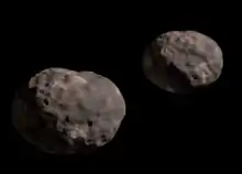 It was estimated[26] that the two components orbit around their center of mass in 4.283±0.004 days at a distance of 680±20 km in a roughly circular orbit.[9] Combining these observations with thermal measurements taken in 2000, the sizes of the components of the system were estimated at 106 km and 98 km, with an equivalent whole-system diameter of 145 km,[9] refined by later measurements from the Keck Observatory to approximately 122 km and 112 km for each partner,[27] and a co-orbital period of 103.5±0.3 hours (4.3125±0.0125 days).[25][19]