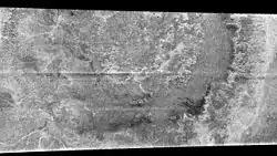 Menrva is the largest crater on Titan, with a diameter of 392 kilometers.[1] The crater is a heavily eroded double ringed impact basin, similar to the impact related features of Mars and Mercury.[2] This is evident by Menrva's distinct lack of a central peak, indicating modification of the crater's surface since formation.[3] It has been estimated that Menrva is approximately 2.8 kilometers deep.