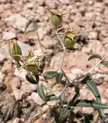 The inflorescence is a cluster of flowers with pale yellow to nearly white petals up to 1.4 centimeters long. The fruit is a cup-shaped utricle under a centimeter wide which contains many lens-shaped, bumpy seeds about 3 millimeters wide.