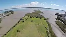 Located between the Point Chevalier and Westmere suburbs and protecting the calm waters of Coxs Bay, it was the site of the city's tip for many years.[4] This has now been capped[5] and replaced by a 15 ha public reserve, with mangrove swamps in the streams and tidal salt marshes either side.[6][7]