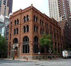 The Merchants National Bank or Brooks Building is a commercial building in Saint Paul, Minnesota, United States, built and opened in 1892 as a financial center in St. Paul's Lowertown neighborhood at the corner of Jackson Street and Fifth Street. The structure, designed by Edward Bassford, uses sandstone in a Richardsonian Romanesque style.[2] The ground floor was occupied by an influential bank, while the upper stories provided law offices. Several office tenants went on to great state or national prominence, including Cushman Kellogg Davis, Cordenio Severance, Frank B. Kellogg, Pierce Butler, and William D. Mitchell.[3] For many years, the building was known as the McColl Building. It is listed on the National Register of Historic Places. The four-story structure was carefully rehabilitated and restored by David A. Brooks, and the building now carries his family name.