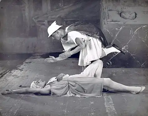 London's Ballet Rambert mounted a more faithful version at the Lyric Theatre, Hammersmith on June 22, 1931. Frederick Ashton choreographed and danced Mercury, Tamara Karsavina guest-starred as Venus, and William Chappell portrayed Apollo.[83] Constant Lambert revived Ashton's production for the Camargo Society at the Savoy Theatre in London on June 27, 1932, with Walter Gore and Alicia Markova as Mercury and Venus (renamed Terpsichore).[79] Lambert also conducted a radio broadcast of Satie's music for Mercure over the BBC on July 13, 1932,[79] and wrote admiringly of it in his book Music Ho! A Study of Music in Decline (1934).[29]