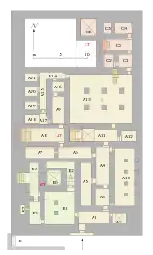 Twenty-one of the mastaba chambers (chambers A) are devoted to Mereruka himself, five are designated to his wife (chambers B) and five were added for his son Meriteti (or Meryteti) (chambers C).[1] The overall external dimensions of Mereruka's mastaba are 23 metres east-west, 30 metres north-south (extending to 41 metres when one includes Meriteti's addition) and 4.5 metres high, while the internal height of the ceiling is just over 4 metres.[1] Princess' complex at the left end of the tomb entrance to Mereruka's tomb depicts her "receiving offerings due to a king's daughter, including a selection of finely carved furniture" while she is shown relaxing and watching several dancing girls".[2] In another scene, "she is portrayed with her three dogs and a pet monkey." On the walls of chamber 7, Waatetkhethor is shown sitting together with Mereruka "on a large couch, while she plays her harp to soothe him". While most of the rooms of Mereruka's mastaba tomb were decorated, those which were left bare were simply used for storage.[4]