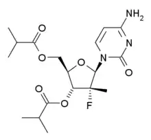 Mericitabine (RG-7128) is an antiviral drug, a deoxycytidine analog (a type of nucleoside analog). It was developed as a treatment for hepatitis C, acting as a NS5B RNA polymerase inhibitor, but while it showed a good safety profile in clinical trials, it was not sufficiently effective to be used as a stand-alone agent. However mericitabine has been shown to boost the efficacy of other antiviral drugs when used alongside them, and as most modern treatment regimens for hepatitis C use a combination therapy of several antiviral drugs, clinical trials have continued to see if it can form a part of a clinically useful drug treatment program.[1][2]