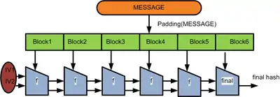 In the diagram, the one-way compression function is denoted by f, and transforms two fixed length inputs to an output of the same size as one of the inputs. The algorithm starts with an initial value, the initialization vector (IV). The IV is a fixed value (algorithm or implementation specific). For each message block, the compression (or compacting) function f takes the result so far, combines it with the message block, and produces an intermediate result. The last block is padded with zeros as needed and bits representing the length of the entire message are appended. (See below for a detailed length padding example.)