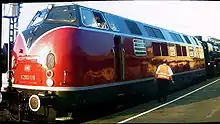 The Merkur was upgraded to TEE on 26 May 1974 as the service was extended north of Hamburg to Copenhagen over the Vogelfluglinie. It was the only TEE service in Denmark and the only TEE using a train ferry during its journey. In order to connect the two capitals Bonn and Copenhagen the Schwabenpfeil was withdrawn and the Merkur used its route and slot south of Hamburg.[4] Between Stuttgart and Hamburg the train was hauled by class 103 electric locomotives, north of Hamburg the German diesel class 221 and the Danish diesel classes MY and MZ were used. The ferry from Rødby Færge to Puttgarden took about 55 minutes, the loading and unloading about 5 minutes on each side. The longer stop at Rødby Færge was caused by customs inspection and not meant to let passengers leave or board the train. In order to cope with the language barrier the train had multilingual (Danish/German/English) stewardesses on board.[5]