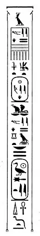 As his name is not mentioned in the Turin King List (probably because the papyrus is very scattered at this point), this ruler is known only for few objects: a sort of copper brazier or basket from a tomb near Abydos (found along with a scribe's palette bearing the name of king Merikare) and now exhibited at the Louvre Museum, an ebony wand from Meir now at the Cairo Museum (JE 42835), an ivory casket fragment from Lisht and some other minor finds.[2][3] Thanks to those few monuments, however, Meryibre's royal titulary is the most complete amongst the known pharaohs of this period.