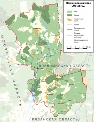 Meshchyora National Park (Russian: Мещёра (национальный парк)) covers extensive wetlands (swamps, peat bogs, rivers and lakes) and pine/birch woodlands in the Meshchera Lowlands on the East European Plain in Vladimir Oblast, about 120 km east of Moscow. The wetland habitat provides for extremely rich biodiversity among the plants and animals.[1] The area is associated with the medieval Meshchera tribe, from which the area takes its name.[2] "Meshchyora" National Park (Мещёра) is not to be confused with "Meshchersky" (Мещёрский) National Park, which is just to the south, over the border in Ryazan Oblast. The Meshchyora NP is located entirely within the Oka River watershed. A small corner of the park touches on the border of the Moscow region. About 39% of the park territory is used and managed for agricultural purposes by local communities.[3]