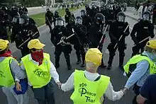 MPT has a history working with both domestic and international peace teams, all of which undergo rigorous training prior to deployment and practice TPNI in the field. Domestic peace teams are usually short-term and last for a few days, while international peace teams are long-term and take place over the course of multiple weeks or months. The goal of the teams is to de-escalate violence and prevent potential armed conflict in places where tension is high and violence is likely to occur. They wear yellow "Peace Team" vests on the site to make their presence recognizable.[36]