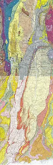 Visually, the Metacomet Ridge exists as one continuous landscape feature from Long Island Sound at Branford, Connecticut to the end of the Mount Holyoke Range in Belchertown, Massachusetts, a distance of 71 miles (114 km), broken only by the river gorges of the Farmington River in northern Connecticut and the Westfield and Connecticut Rivers in Massachusetts.[1] It was first identified in 1985 as a single geologic feature consisting of trap rock by the State Geological and Natural History Survey of Connecticut.[4] A 2004 report conducted for the National Park Service extends that definition to include the entire traprock ridge from Long Island Sound to the Pocumtuck Range in Greenfield, Massachusetts.[1] Further complicating the matter is the fact that traprock only accounts for the highest surface layers of rock strata on the southern three–fourths of the range; an underlying geology of related sedimentary rock is also a part of the structure of the ridge; in north central Massachusetts it becomes the dominant strata and extends the range geologically from the Holyoke Range another 35 miles (56 km) through Greenfield to nearly the Vermont border.[5][6] This article describes the entire Metacomet Ridge and all geologic extensions of it.