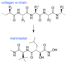 The first generation of MMP inhibitors were based on the structure of the collagen molecule. In the design of these inhibitors, the basic protein backbone of collagen is maintained but the amide bond is replaced with a zinc-binding group.[11] This group of inhibitors contain a hydroxamate (-CONHOH) group that binds the zinc atom in the active site of the MMP enzyme, therefore this group is called "hydroxamate-based MMP inhibitors“.[6] An example can be seen in Marimastat, a first generation inhibitor, which has a similar backbone and sidechain format to collagen.