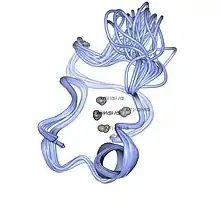 Tertiary structure of MTs is also highly heterogeneous. While vertebrate, echinoderm and crustacean MTs show a bidominial structure with divalent metals as Zn(II) or Cd(II) (the protein is folded so as to bind metals in two functionally independent domains, with a metallic cluster each), yeast and prokaryotic MTs show a monodominial structure (one domain with a single metallic cluster). In yeast, the first 40 residues in the protein wrap around the metal by forming two large parallel loops separated by a deep cleft containing the metal cluster.[9] Although no structural data is available for molluscan, nematoda and Drosophila MTs, it is commonly assumed that the former are bidominial and the latter monodominial. No conclusive data are available for Plant MTs, but two possible structures have been proposed: 1) a bidominial structure similar to that of vertebrate MTs; 2) a codominial structure, in which two Cys-rich domains interact to form a single metallic cluster.
