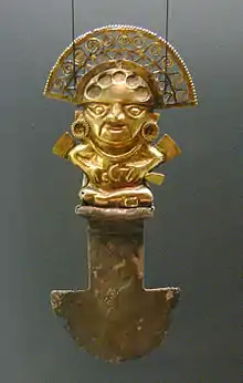 Metallurgy in pre-Columbian America is the extraction, purification and alloying of metals and metal crafting by Indigenous peoples of the Americas prior to European contact in the late 15th century. Indigenous Americans have been using native metals from ancient times, with recent finds of gold artifacts in the Andean region dated to 2155–1936 BCE,[1] and North American copper finds dated to approximately 5000 BCE.[2] The metal would have been found in nature without need for smelting, and shaped into the desired form using hot and cold hammering without chemical alteration or alloying. To date "no one has found evidence that points to the use of melting, smelting and casting in prehistoric eastern North America."[3] In South America the case is quite different. Indigenous South Americans had full metallurgy with smelting and various metals being purposely alloyed. Metallurgy in Mesoamerica and Western Mexico may have developed following contact with South America through Ecuadorian marine traders.[4]