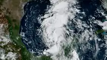 On the morning of August 20, the NHC began to feature the remnants of Harvey on their Tropical Weather Outlooks, assessing it with a medium chance of redevelopment over the next five days.[15] However, this was increased to high just hours later after showers and thunderstorms associated with the system increased in coverage.[16] The system regained winds of tropical storm-force later on August 20, yet a closed circulation still could not be found.[17] Harvey's remnant trough continued to move steadily westwards to west-northwestwards towards Belize and the Yucatán Peninsula through August 21, passing over the latter on August 22.[18] As the low-pressure area associated with ex-Harvey moved over land, its circulation became better defined, and the NHC noted that tropical cyclone development was almost a certainty over the next few days as the system entered the Bay of Campeche. At this time, the NHC also mentioned the possibility of hurricane-force winds affecting the coast of Texas.[19] The NHC's forecasts came to fruition at 12:00 UTC on August 23 as Harvey regenerated into a tropical depression 175 mi (280 km) west of Progreso, Mexico,[2] after the presence of a closed circulation was finally confirmed.[20]