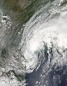 By late on August 27, the cyclone completed an anticyclonic loop and began a slow southeastward drift towards the Gulf of Mexico; at this time Harvey was only a minimal tropical storm.[2][40] Deep convection formed repeatedly in Harvey's right semicircle as it had remained over water, which likely helped the system to sustain tropical-storm-force winds despite being centered over land.[41] Still moving slowly, Harvey emerged back over water into Matagorda Bay late on August 28.[42] Once back over the warm waters of the Gulf of Mexico, deep convection blossomed well to the north of the center of the tropical storm, which led to slight strengthening.[43] The center of the storm continued to drift to the east-southeast into the early hours of August 29, but never strayed more than 70 mi (110 km) away from the Texan coast. Convection blossomed again later that day, with the center jumping northwards into the convection as Harvey began moving to the northeast. Consequently, Harvey's winds reached a third and final peak of 50 mph (85 km/h) at 18:00 UTC. As a ridge built over the western Atlantic, Harvey began to be steered north-northeastwards back towards the United States coast. Strong vertical wind shear weakened the storm somewhat as it approached the coast of Louisiana, though the central pressure continued to fall to around 990 mbar (hPa; 29.23 inHg).[2]