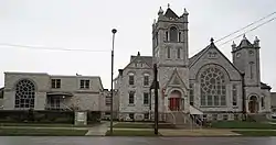 The Methodist Episcopal Church is a historic church at 116 E. Schwartz Street in Salem, Illinois. The church was built in 1907 for Salem's congregation of the Methodist Episcopal Church; the congregation had to raise the funds for the church twice, as its treasurer stole the original funds during its construction. Architects Charles Henry and Son of Ohio designed the church in the Richardsonian Romanesque style. Their design includes a rusticated stone exterior, a large rounded window, arched entrances supported by stone columns, and two square towers. An education building with a matching rounded window was added to the west end of the church in 1960. Interior designer and church member Vi Mueller redesigned the church's sanctuary in 1968; her design repurposed household items to create elaborate decorations at a low cost.[2]