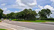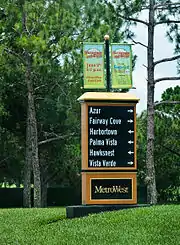 Work on the Metrowest Golf clubhouse was started in 1986. It was opened and dedicated the following year. The course was first managed by the Arnold Palmer Golf Management.[1][9] Residential development near the community's 18-hole golf course was started in 1987. By 1989, about 700 single-family homes or villas have been built or planned. Another 1,300 apartment units had been built or were on the drawing boards. Development was also started on the community's most exclusive residential area, Palma Vista, a planned 200-lot subdivision that surrounds the 13th and 14th holes of the golf course on the highest land in the community. The crest of the property, at an elevation of 198 feet (60 m) above sea level, is one of the highest points in Orange County and offers views of downtown Orlando's skyline 5 miles (8.0 km) to the east.[2] The community's first shopping center, MetroWest Village at the corner of S. Hiawassee Rd and Westpointe Blvd, was opened in the fall of 1990 completely leased.[10]