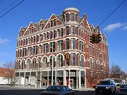 The Metropolitan Block is a five-story building constructed in a Victorian version of the Romanesque Revival style. Built primarily of brick, the block includes many stone details throughout its exterior, supporting elements of cast iron on the first floor, and the original glass windows of its storefronts.[2] Among the building's decorative elements are transom windows of lavender-colored glass above the entrances, awnings of canvas covering the sidewalks around the building, and turrets at the top of the facade.[2]