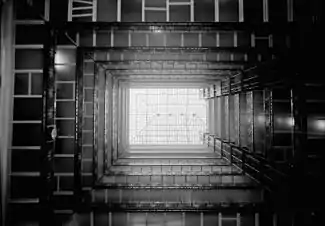 The building is considered the city's first skyscraper, with 12 stories and standing 218 feet (66 m) tall. Small observation towers poked up above the corners, and the rooftop had a popular garden. It was built of green New Hampshire granite and red Lake Superior sandstone, with the interiors dressed in antique oak and beautiful ornamental iron and brass work by Crown Iron Works Company of Minneapolis. A large skylight allowed the interior to be safely lit in a time when electric lighting was rare (though the building was eventually wired), and the floors of walkways circling the center court were translucent to allow more light to filter through.[1] Architect E. Townsend Mix designed the building, and it is considered to be his most notable achievement. Many of the city's most prestigious companies had offices in the Metropolitan.[2]