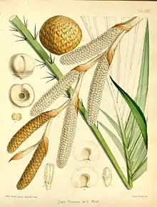 Metroxylon vitiense will grow between 5 to 16 m (16 to 52 ft) tall and its trunk will grow to a diameter of 36 to 50 cm (14 to 20 in). The leaf base and petiole are covered with rows of pointy spines.[7] It takes approximately 20 years of growth before the palm begins to bear fruit.[8] Its fruit can vary in color and shape, even within the same stand of trees, similar to other species of Metroxylon. The fruit is round but not always spherical; it can be elliptical or ovular in shape. The fruit has scales, similar to a pineapple, but whose color varies from green to golden yellow to dark brown to grey.[7] Like other species of Metroxylon, M. vitiense propagates by seed, which germinates from its fruit. The palm is monocarpic and dies after it flowers and sets seeds, similar to the century plant and the Hawaiian silversword.[10]