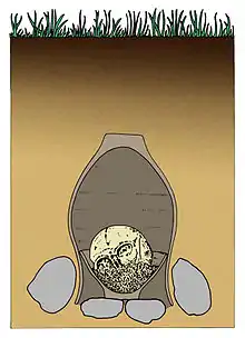 The foot shell was placed on three smaller stones. It was made from a greyish brown clay having a height of 105 millimetres (4.1 in) and diameters of 83 millimetres (3.3 in) at the stand and 207 millimetres (8.1 in) at its mouth. The outside wall of the vessel is irregularly decorated with 23 millimetres (0.91 in) long parallel impressions of a comb-like tool. Inside, the foot shell was filled up to a height of two-thirds with humus soil on which the skull lay. The giant beaker was placed upside down over the cup. The retracted walls below the mouth of the vessel were carefully framed with larger stones. The giant beaker consists of a brownish-gray to reddish-brown clay. It has a height of 425 millimetres (16.7 in) with diameters of about 97 millimetres (3.8 in) at the base and 240 millimetres (9.4 in) at the mouth. Its largest diameter is 195 millimetres (7.7 in) to 210 millimetres (8.3 in) at a height of 265 millimetres (10.4 in) from the base. The shards of the damaged vessels base could not be recovered. Below the vessels rim, the vessel is decorated with an irregular series of small triangular recesses, whose tips are directed downward. Prior to its discovery the vessel and its interior was intact but it has been damaged with the bulldozer.[4] The shape of the giant beaker corresponds to the Bentheim group, defined by Karl Hermann Jacob Friesen,[5] although this vessel stands out because of its size. Wegewitz interprets the giant beaker as storage vessel. The skull has been preserved from its cranium to the ear bones and nasal bone, while the facial skeleton and jaws were probably decomposed after the funeral. The closed air space inside the large vessel favoured the preservation of the skull as opposed to being stored in well-aerated sandy soil at the site. In the earthy filling of the foot shell a few remains of tooth enamel were found. Due to its small amount Wegewitz suspected that at the times of the funeral only the head and upper jaw were present while the lower jaw and cervical vertebrae were already lost. The skull was anthropologically determined as most likely that of an adult male. Whether the burial was dug in a pit into the ground or settled above the ground could not be determined due to lack of soil discolouration at site. Likewise, it remains unclear whether the head burial was created in close proximity to a possibly nearby or lost full body burial.[4]