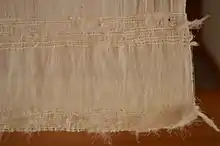 One other way to use feathers was the creation of garments either decorated with feathers or with thread which was created by spinning cotton and feather shreds. The garments of eagle warriors were completely covered in feathers. Fabric made of the latter was favored by the nobility, both men and women which distinguished them from commoners.[4][11] Little is known how feathers were incorporated into fabric in the Mesoamerican period.[33] The only vestige of this practice is the making of wedding huipils in the town of Zinacantán in Chiapas. Although research has shown this practice is descended from the Mesoamerican one, it is still different. The Mesoamerican feathered cloth was made with thread made of cotton fiber and feathers done on a backstrap loom, which the current wedding huipils incorporate feathers into commercially spun cotton thread.[26][34]