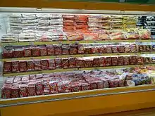 Hot dogs (Thai: ฮอตดอก; RTGS: hotdok; IPA: [hɔ́t dɔ̀ːk]) are very popular in Thailand and are also used in various ways in Thai cuisine. It can be sold inside a bun similar to a standard American hot dog[68] but instead of tomato ketchup, they are also often eaten with a sweet tomato-chili sauce. Very popular are street vendors selling hot dogs which have been deep-fried or charcoal grilled. They are served with either a sweet, slightly spicy sauce (nam chim wan) or a very spicy sauce (nam chim phet). Hot dogs can also be used as a filling for a croissant which are served with mayonnaise. Hot dogs are even used as a filling for raisin bread together with shredded dried pork.[69][70][71][72][73] The Thai dish called khao phat Amerikan or American fried rice, rice fried with tomato ketchup and containing raisins, is always served with hot dogs and a fried egg.[74] Donut sai krok is the Thai name for a sausage filled savoury donut in the shape of a log.[73] Hot dog sausages also feature as an ingredient, together with onion, celery or coriander (cilantro) leaves, lime juice, fish sauce and chili peppers, for a Thai salad called yam hot dok. Another dish that uses hot dogs is called khanom Tokiao (lit. 'Tokyo cake'). This is a Thai style crêpe which is wrapped around a filling of hot dog and sweet chili sauce. The chili sauce can also be served on the side.[75][76][77][78]