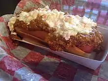A hot dog with a chili sauce made with finely ground meat, chopped fresh onions, coleslaw and yellow mustard.[45]"The Art of Bun, Chili + Slaw, West Virginia Style" Archived August 15, 2016, at the Wayback Machine, The Local Palate. Retrieved July 16, 2016. "Even more telling is the nature of the chili on each. This is not your mama’s bowl chili with chunks of meat and arguable accouterments like beans, tomatoes, peppers and, Lord help us, sometimes spaghetti. Chili Bun Chili is a finely grained aggregate of ground beef, spices and something to make it all hold together in the bun."[46]