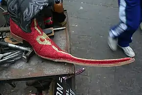 The pointy boots are made by elongating the toe of normal boots by as much as 5 feet (1.5 m), causing the toes to curl up toward the knees. The boots are then further modified according to the wearer's personal taste. Alterations incorporate paint and sequins and can go as far as adding flashing LEDs, disco balls, and mirrors.[1][2]