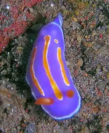 Mexichromis trilineata is a colourful species of sea slug, specifically a dorid nudibranch. This marine gastropod mollusc is in the family Chromodorididae.[3][4] In 2012 the genus Pectenodoris was included into Mexichromis.[5]