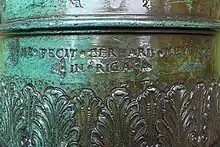 The next year he appears in Florence where he cast the Bathing Venus for Giambologna, court sculptor of the Medici. In Florence he appears to have joined the German speaking community, which gathered in the Compagnia di Santa Barbara, a religious brotherhood.[37] In their documents a "Gherardo fiammingho" is mentioned shortly after the cast of the Venus. Thanks to the reuse of his set of punches by later generations of his family one can assume that Gerhardt (I) returned to Sweden at some point. He could be identical with a homonymous goldsmith (Giert Meyer), active in Stockholm between 1626 and 1631.[38] This goldsmith Meyer was a protégé of Erich Larsson von der Linde, future father-in-law of Gerhardt (II).[39] At the time it was not unusual for trained goldsmiths to be active in the challenging bronze-casting of monumental figures: Benvenuto Cellini and Balthazar Keller are two famous examples.